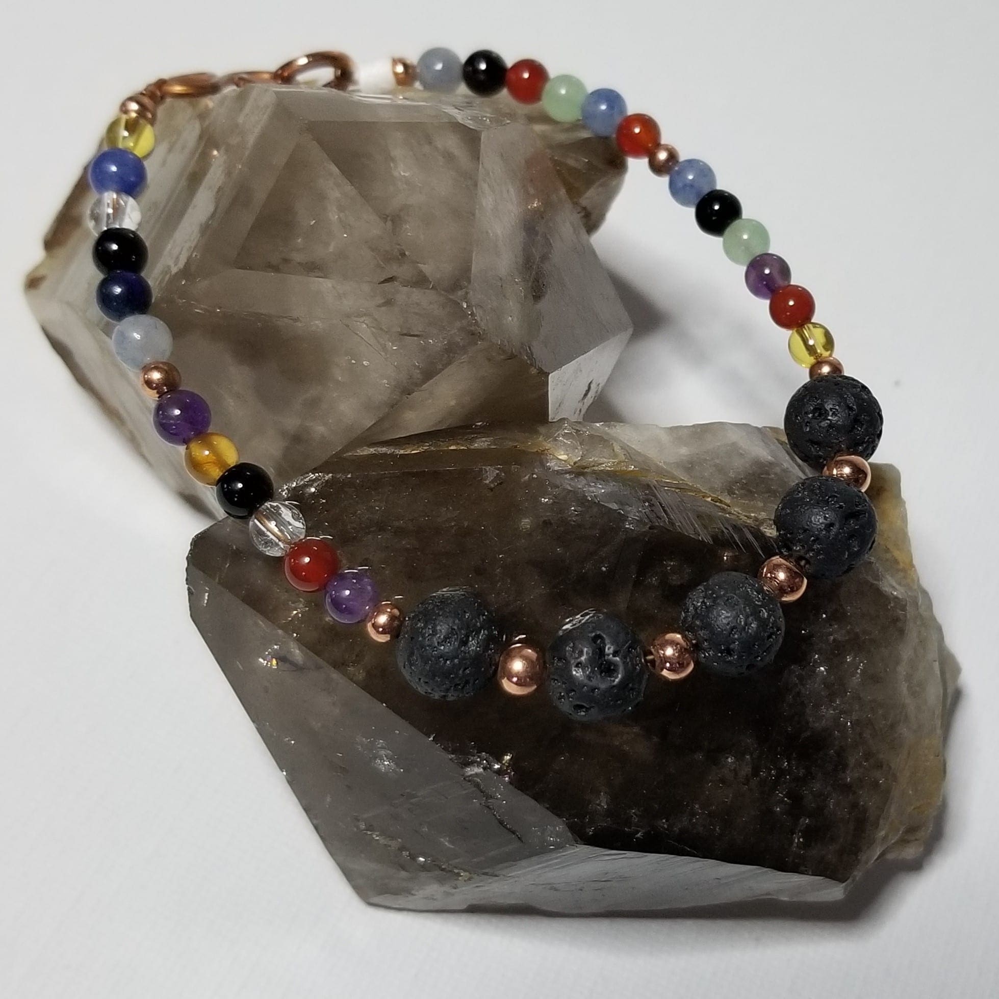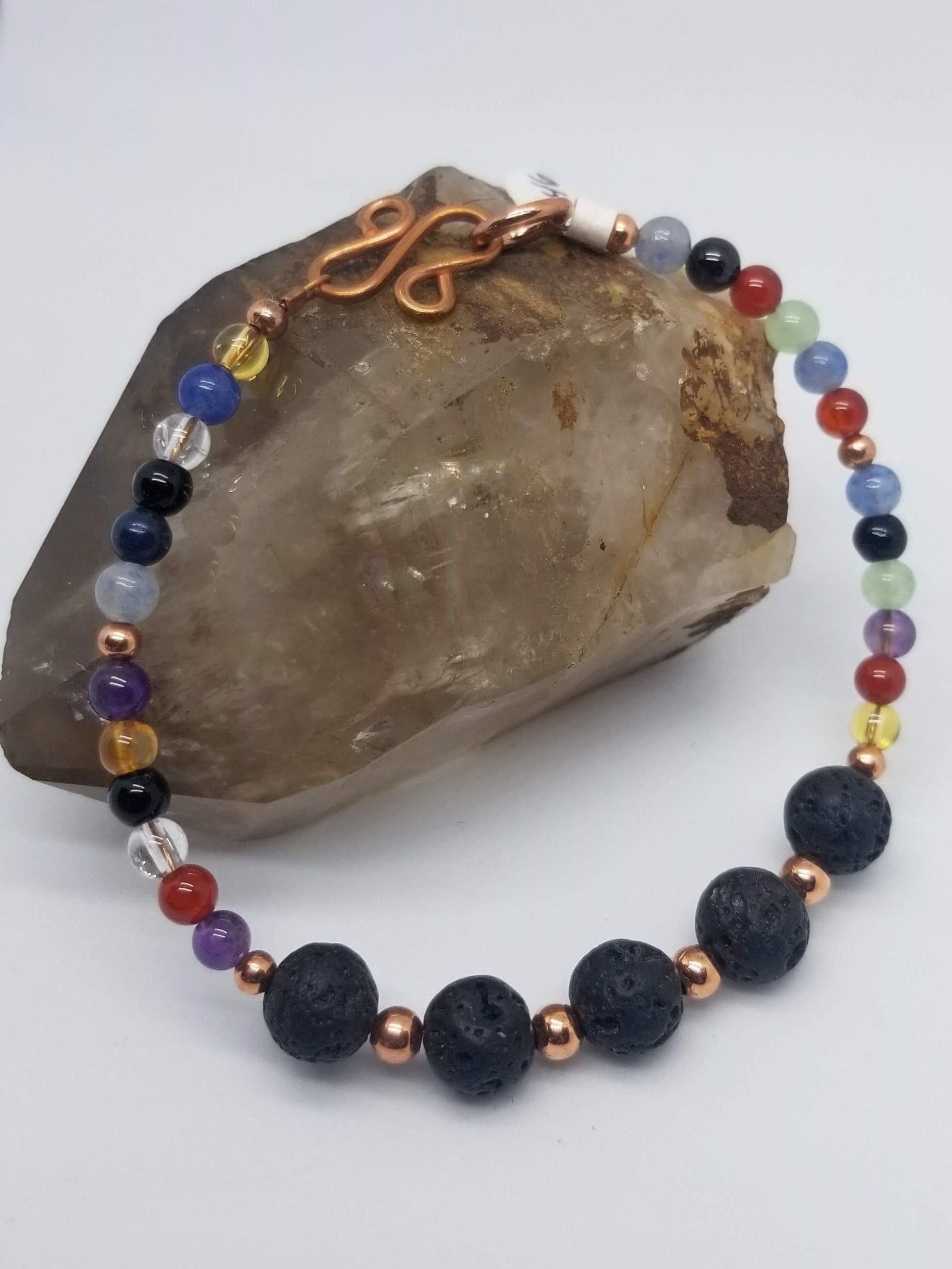 This bracelet features lava beads that can be used to diffuse essential oil to the wearer. It also focuses on the seven chakras with semi-precious gemstones completing the band to the given size. Designed with a handcrafted copper clasp.
