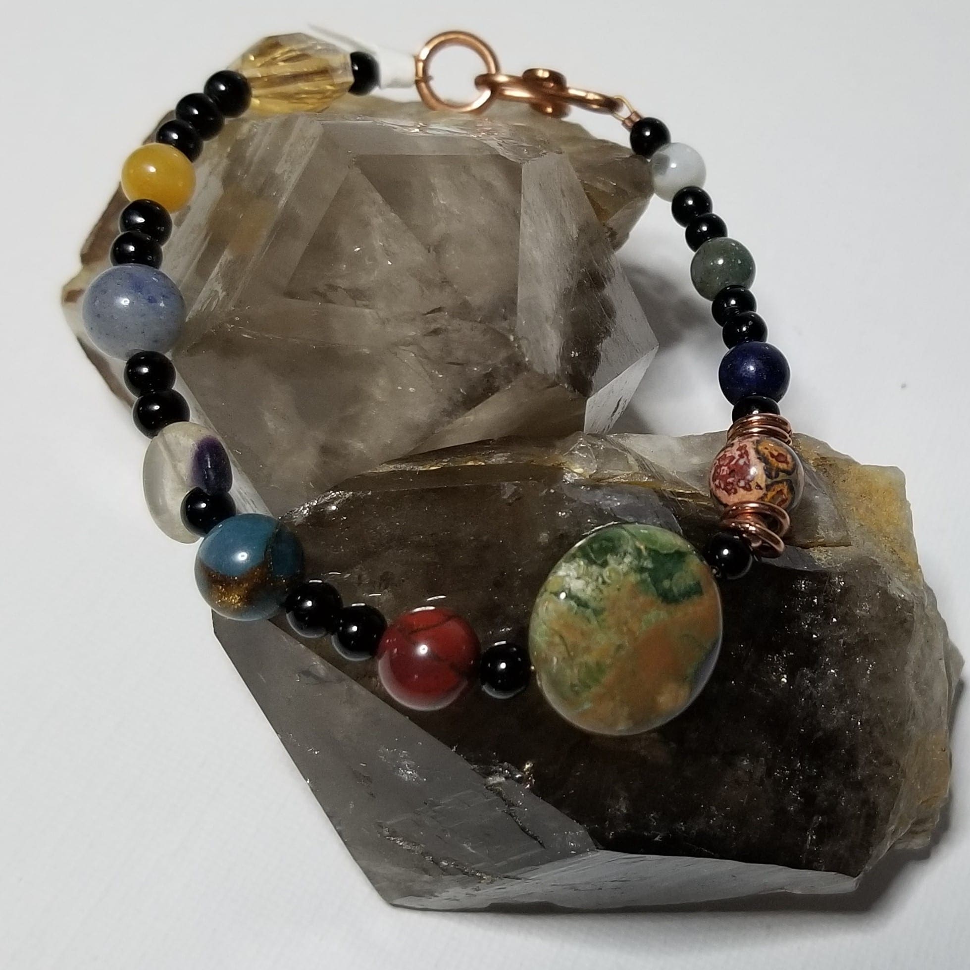 Wear our solar system on your wrist with this bracelet. A faceted glass bead shines as the sun while the planets are represented by various gemstone beads. The band is made up of black jasper, blue sandstone, or white shell beads to size. The men’s bracelet uses larger sized beads to complet the band.