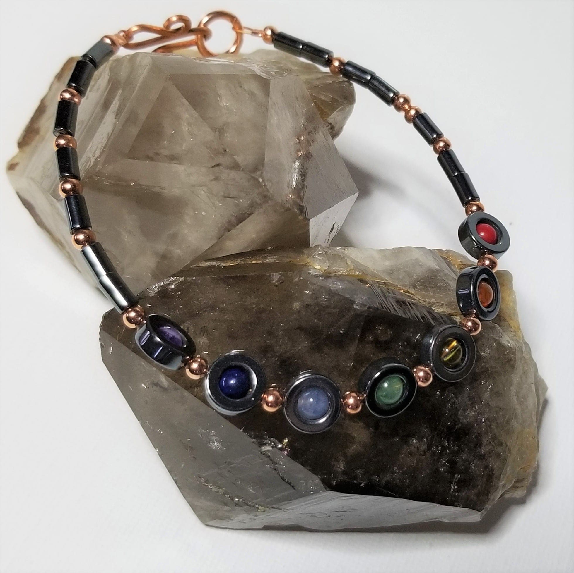 This bracelet focuses on the seven chakras with semi-precious gemstones related to each of the seven chakras. Each of the chakra beads are at the center of small hematite circles. Hematite and copper beads complete the band to the given size. Designed with a handcrafted copper clasp.